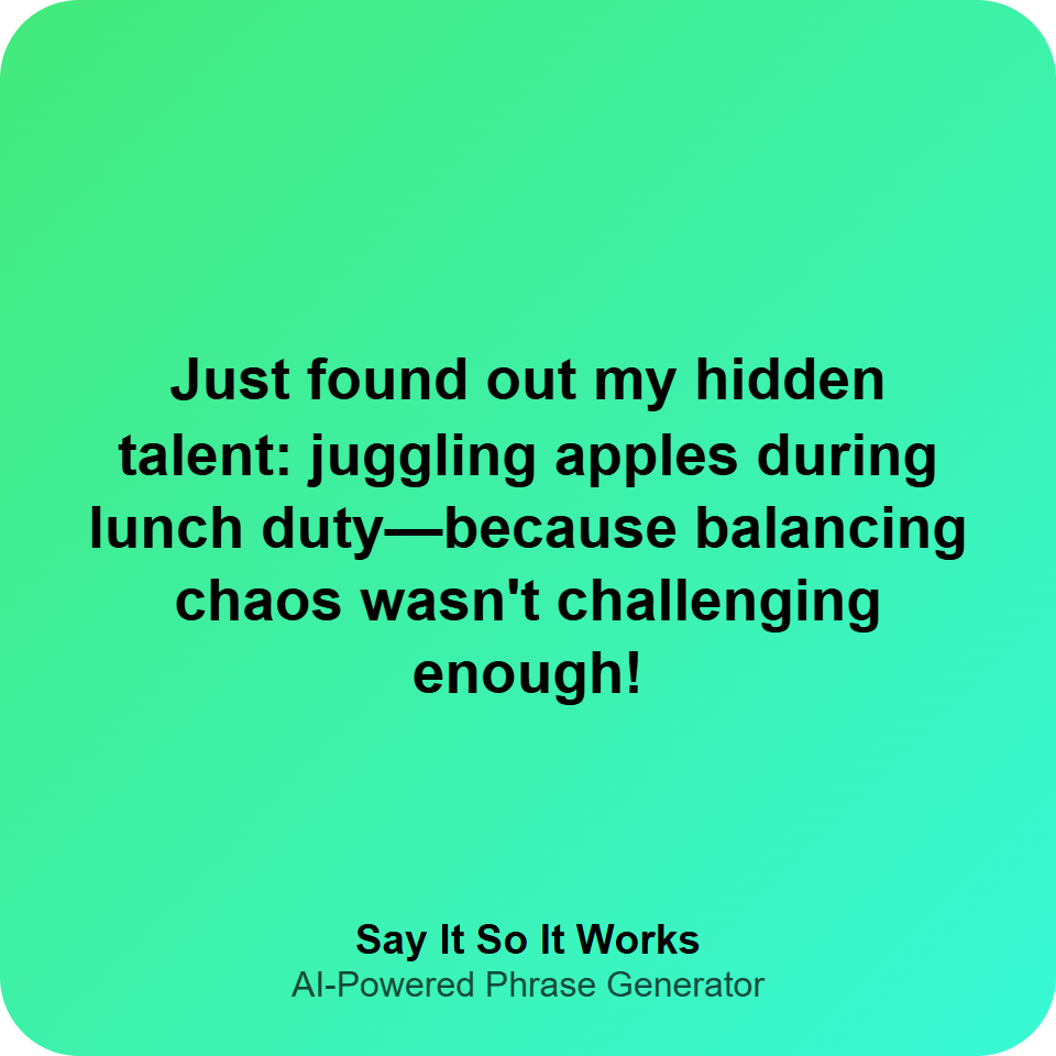Just found out my hidden talent: juggling apples during lunch duty—because balancing chaos wasn't challenging enough!