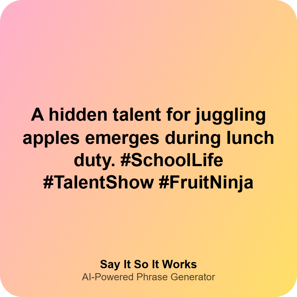 A hidden talent for juggling apples emerges during lunch duty. #SchoolLife #TalentShow #FruitNinja
