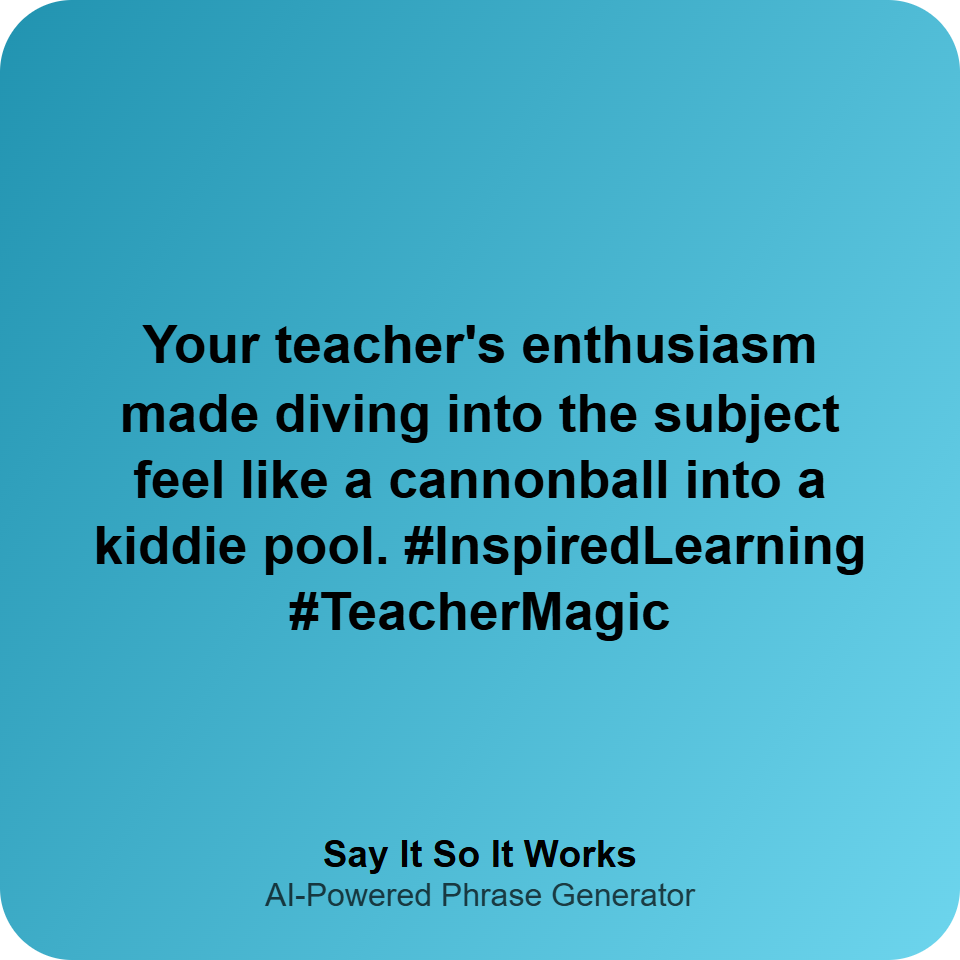 Your teacher's enthusiasm made diving into the subject feel like a cannonball into a kiddie pool. #InspiredLearning #TeacherMagic