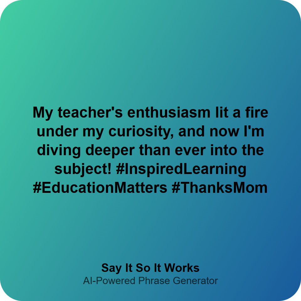 My teacher's enthusiasm lit a fire under my curiosity, and now I'm diving deeper than ever into the subject! #InspiredLearning #EducationMatters #ThanksMom